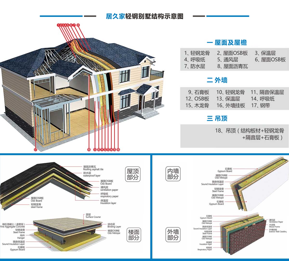 居久家輕鋼別墅隸屬于四川萬(wàn)建城建筑工程有限公司,集科研、設(shè)計(jì)、咨詢、加工、生產(chǎn)安裝為一體。一直致力于新型輕鋼結(jié)構(gòu)房屋的研究、開(kāi)發(fā)和應(yīng)用,倡導(dǎo)房屋建筑的設(shè)計(jì)和應(yīng)用在標(biāo)準(zhǔn)化、模塊化、通用化、規(guī)?;a(chǎn)的同時(shí),實(shí)現(xiàn)人居環(huán)境的個(gè)性化、人性化、以及健康和舒適。 公司目前引進(jìn)具有國(guó)內(nèi)先進(jìn)水平輕鋼結(jié)構(gòu)房屋建筑技術(shù)和生產(chǎn)線,標(biāo)準(zhǔn)化、精細(xì)化和定制化設(shè)計(jì)、制造、安裝輕鋼結(jié)構(gòu)房屋。不僅能夠提供風(fēng)格各異的別墅建筑,同樣能夠提供行業(yè)標(biāo)準(zhǔn)的輕鋼樓宇建筑及建筑群。居久家裝配式房屋技術(shù)體系是高效節(jié)能型綠色建筑體系,各項(xiàng)建筑物理性能卓越,處于業(yè)內(nèi)先進(jìn)水平,能夠?yàn)榭蛻籼峁┤棠K化綠色建筑集成解決方案。